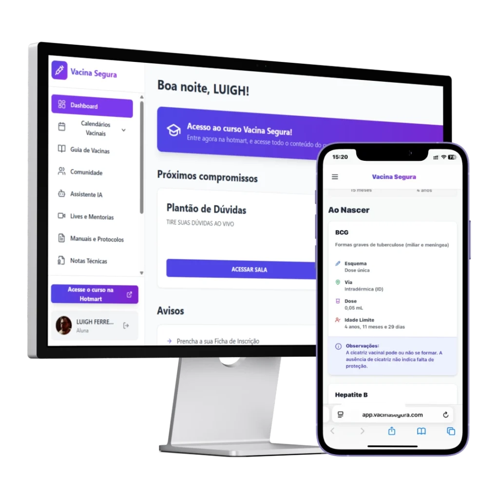 A ideia do Vacina Segura é justamente garantir que você consiga aplicar tudo o que aprende, desde o básico até as técnicas mais avançadas. Você terá acesso a conteúdos práticos, aulas ao vivo para tirar dúvidas e, além disso, uma comunidade de profissionais da área para trocar experiências e receber ajuda. E, se precisar de suporte extra, nossa equipe estará disponível para orientá-lo, garantindo que você avance com confiança!